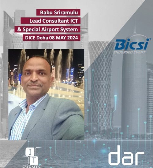 DICE DOHA BICSI ENDORDED event by ITEVENTS In the Audiovisual industry for over 10 years, all with Techno QQualification: Masters in Wireless Communication Systems Engineering fromLondon, UK.Certification: Certified Technology Specialist (CTS) by AVIXA (AudiovisualIntegrated Experience Association More about DICE Qatar...